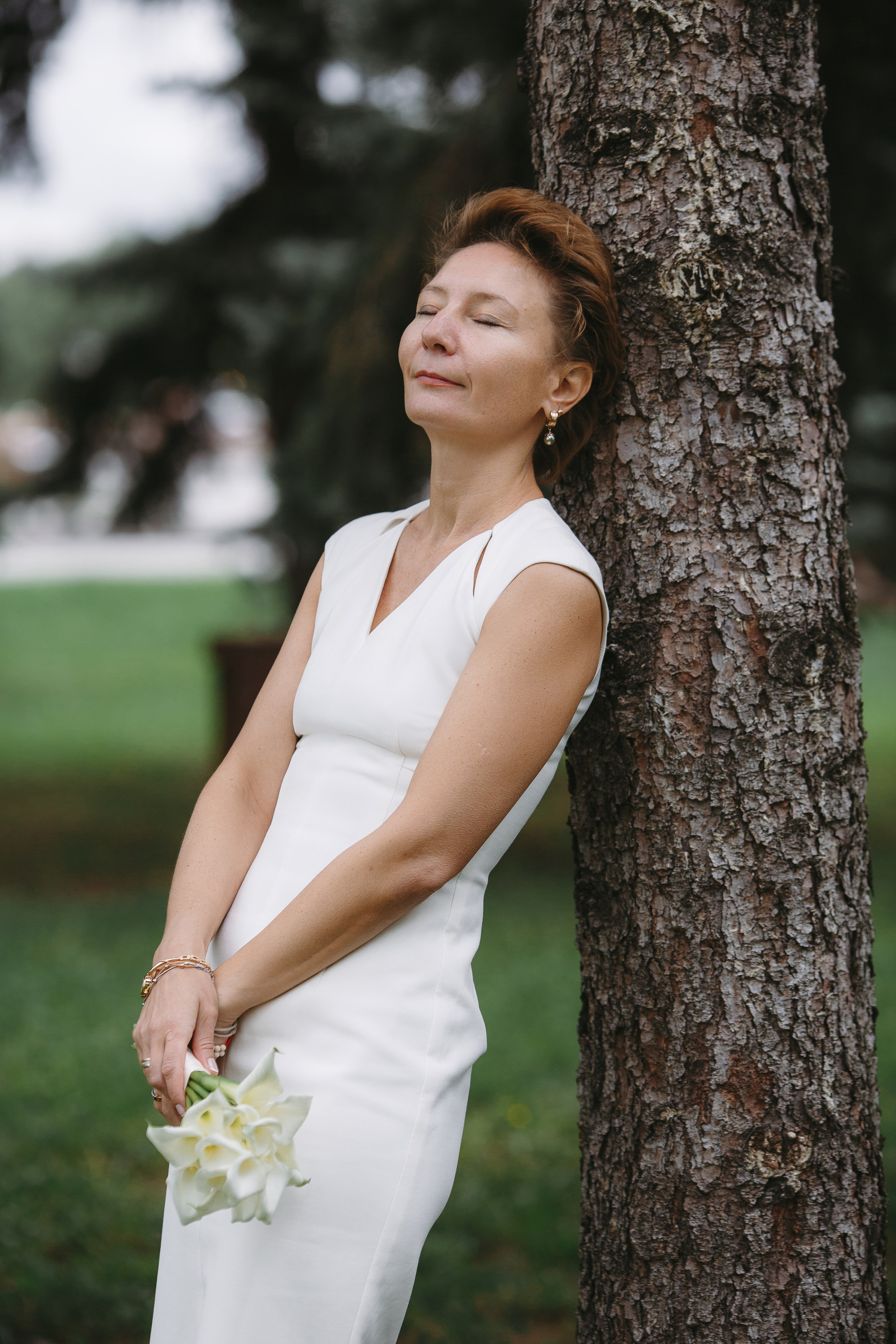 Тёплый день, зелень деревьев и лёгкий ветерок — идеальная атмосфера для их фотосессии. Вера в красивом платье...